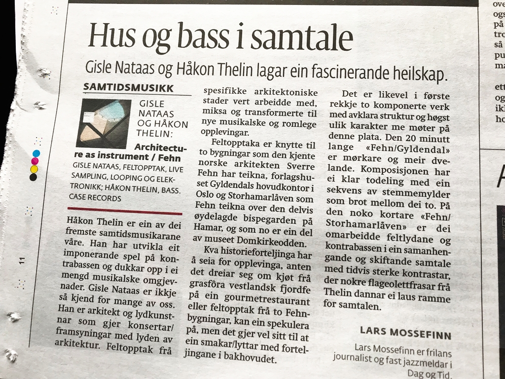 Det er kanskje derfor Nataas har tatt med seg bassisten Håkon Thelin på plata. Thelin representerer en slags forgrunn. Han er «mennesket i byggverket». Den overtonerike kontrabassen responderer, kontrasterer, og bygger videre på de lydlige situasjonene som Nataas setter opp. Thelin danner en organisk motstemme til betongklangen, på samme måte som Fehn kontrasterer det tradisjonelle og det moderne; rødmalt treverk mot grå betong.