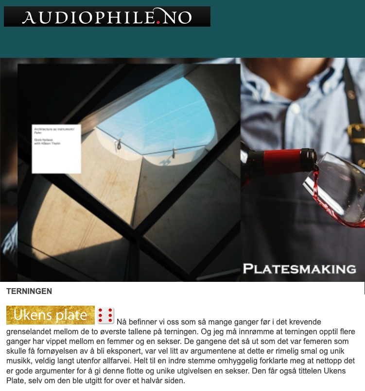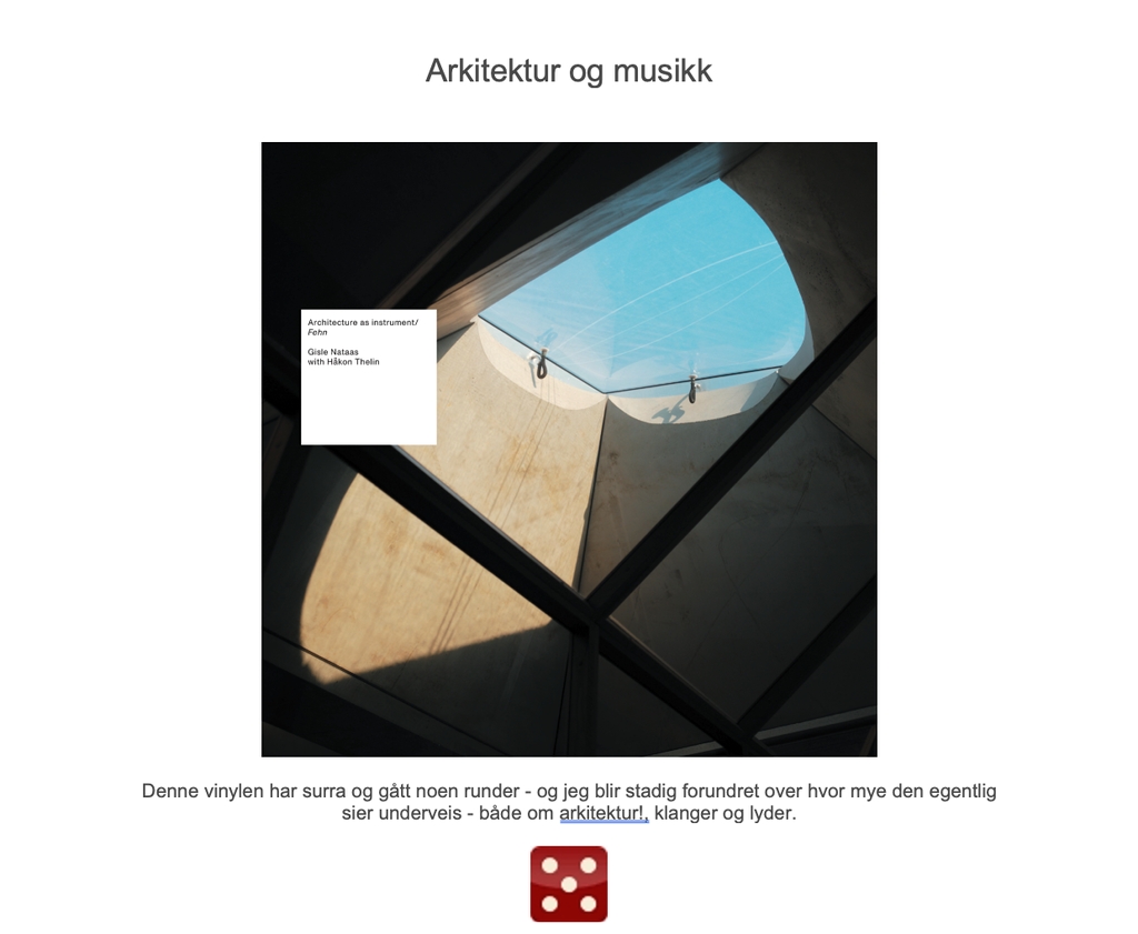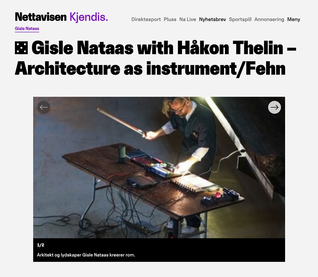 Musikken blei framført live på Ultimafestivalen i 2023 og der møtte Nataas sine lydlandskap publikum sammen med med bassisten Håkon Thelin. Her blir arkitekturen som instrument videreformidla i vinylformat og jeg har blitt den lykkelige eier av eksemplar nummer 64. Der får jeg også ei skriftlig innføring i hvordan de to har tenkt for å skape liv eller videreformidle livet i romma, mikrofonbruken og møtet mellom alle kildene. Jeg blir fascinert av musikken, måten Nataas og Thelin har tenkt på og måten jeg tror Fehn har gått frem for å skape romma. «Architecture as instrument» har sjølsagt blitt totalt annerledes enn alt annet som har vederfaret mitt sanseapparat. Det har jeg veldig godt av.